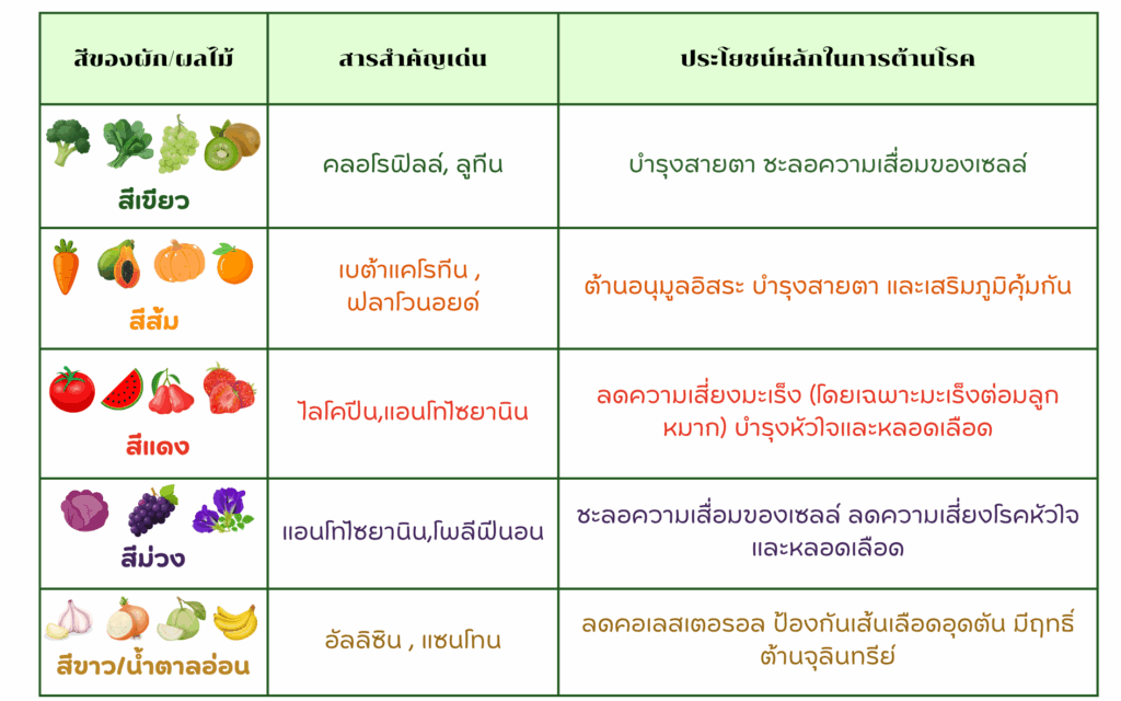 หมายเหตุ : ข้อมูลนี้มีวัตถุประสงค์เพื่อให้ความรู้ด้านสุขภาพทั่วไป การบริโภคผักและผลไม้เป็นส่วนหนึ่งของการมีสุขภาพที่ดี แต่ไม่สามารถทดแทนการรักษาทางการแพทย์ได้