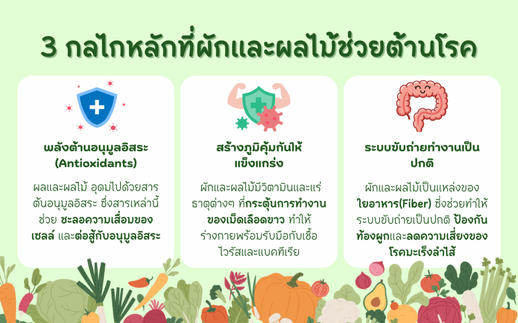 ผักและผลไม้เป็นขุมพลังในการ เสริมสร้างระบบภูมิคุ้มกัน ของร่างกายให้พร้อมรับมือกับเชื้อไวรัส และแบคทีเรียที่เข้าสู่ร่างกาย